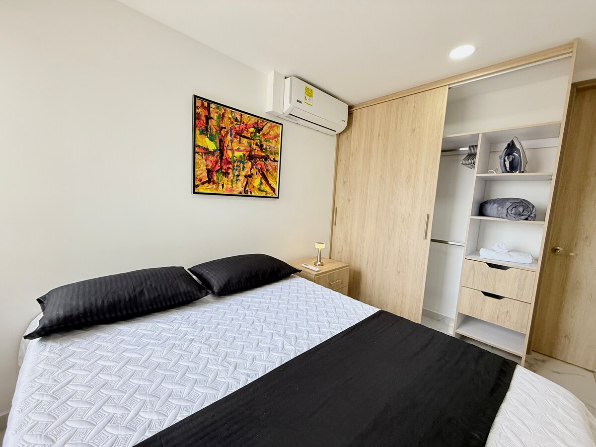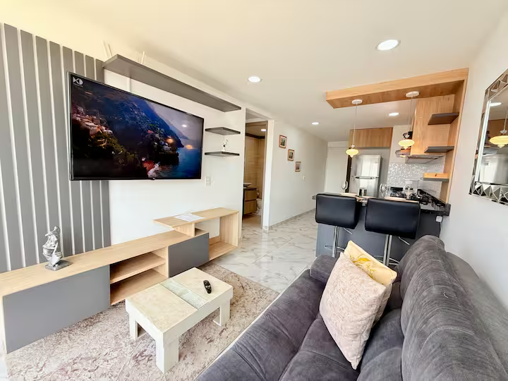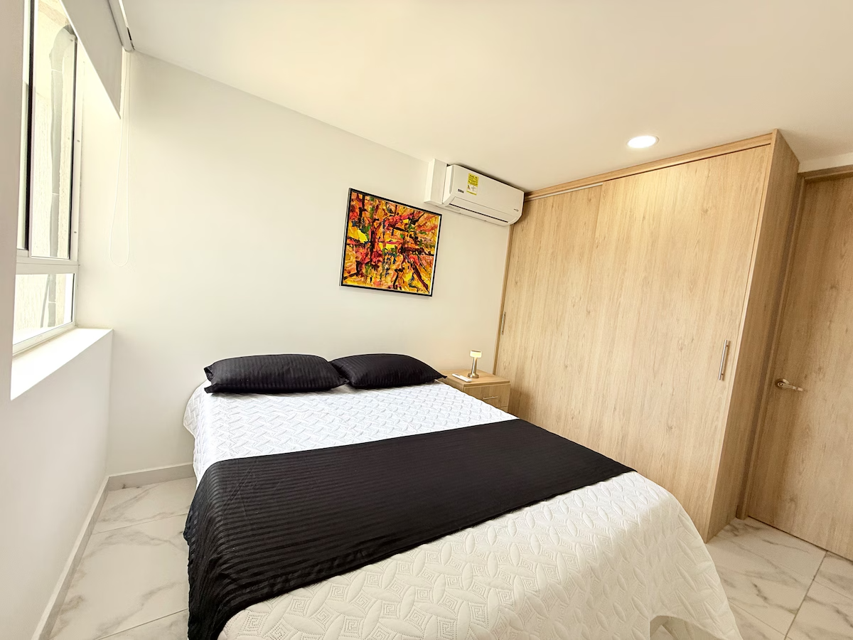 El apartamento cuenta con dos habitaciones con cama doble, una de ellas con aire acondicionado y baño privado. Dispone además de sala de TV con sofá cama, cocina totalmente equipada y espacios cómodos para una estadía funcional.