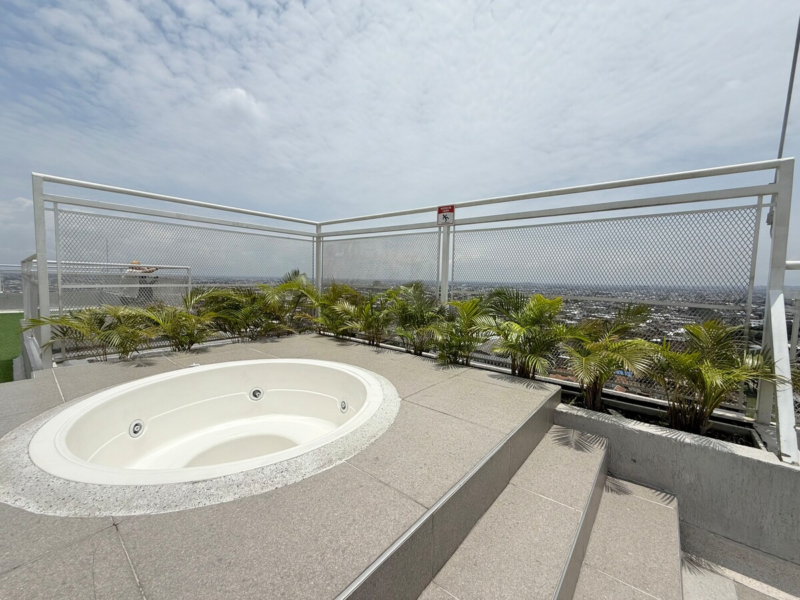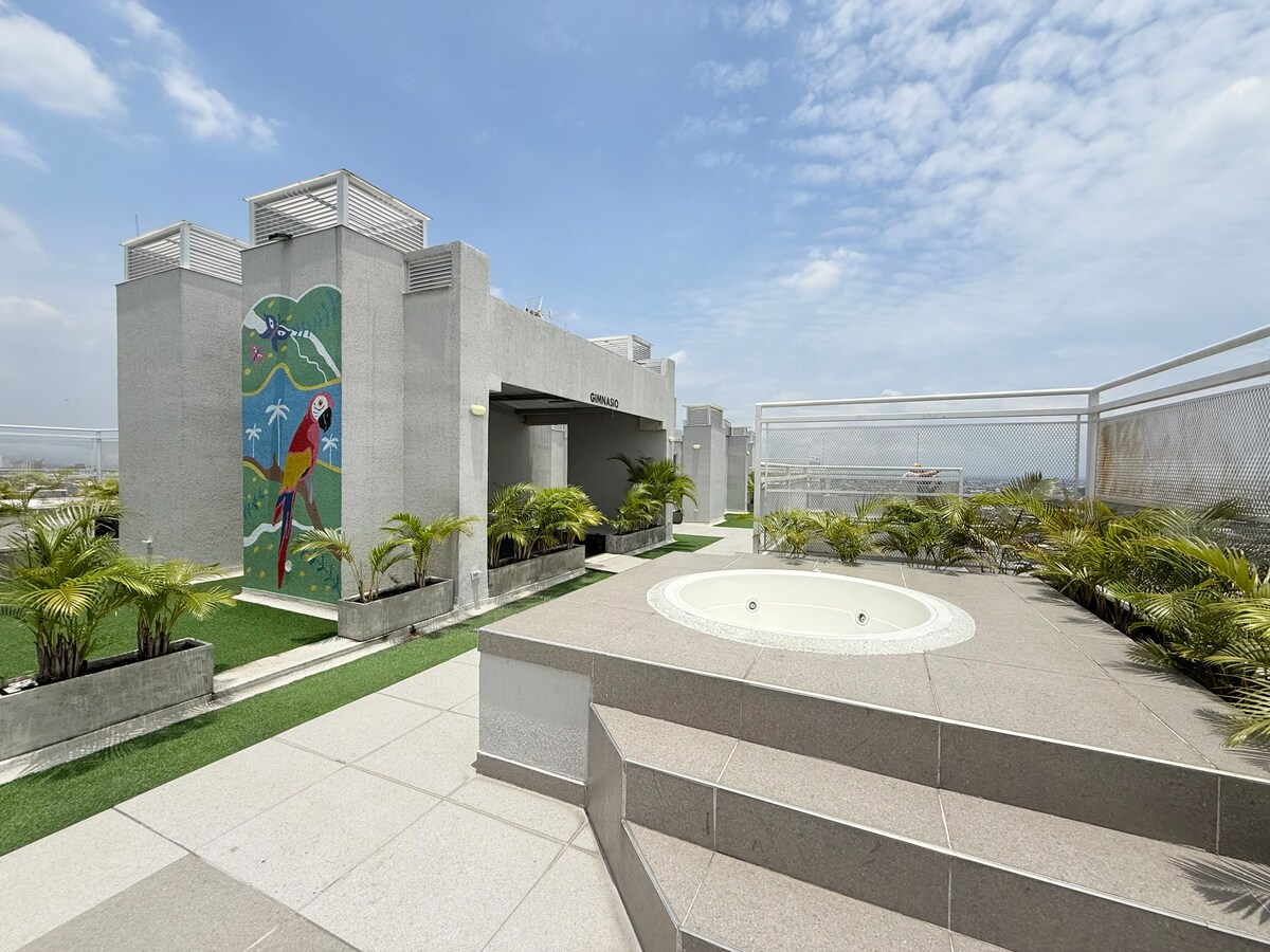Se encuentra en un conjunto cerrado con seguridad 24/7, lobby con atención permanente y acceso autónomo mediante cerradura digital. El edificio ofrece parqueadero privado cubierto, zona de juegos para niños y una terraza con hidromasaje, disponible con reserva previa.