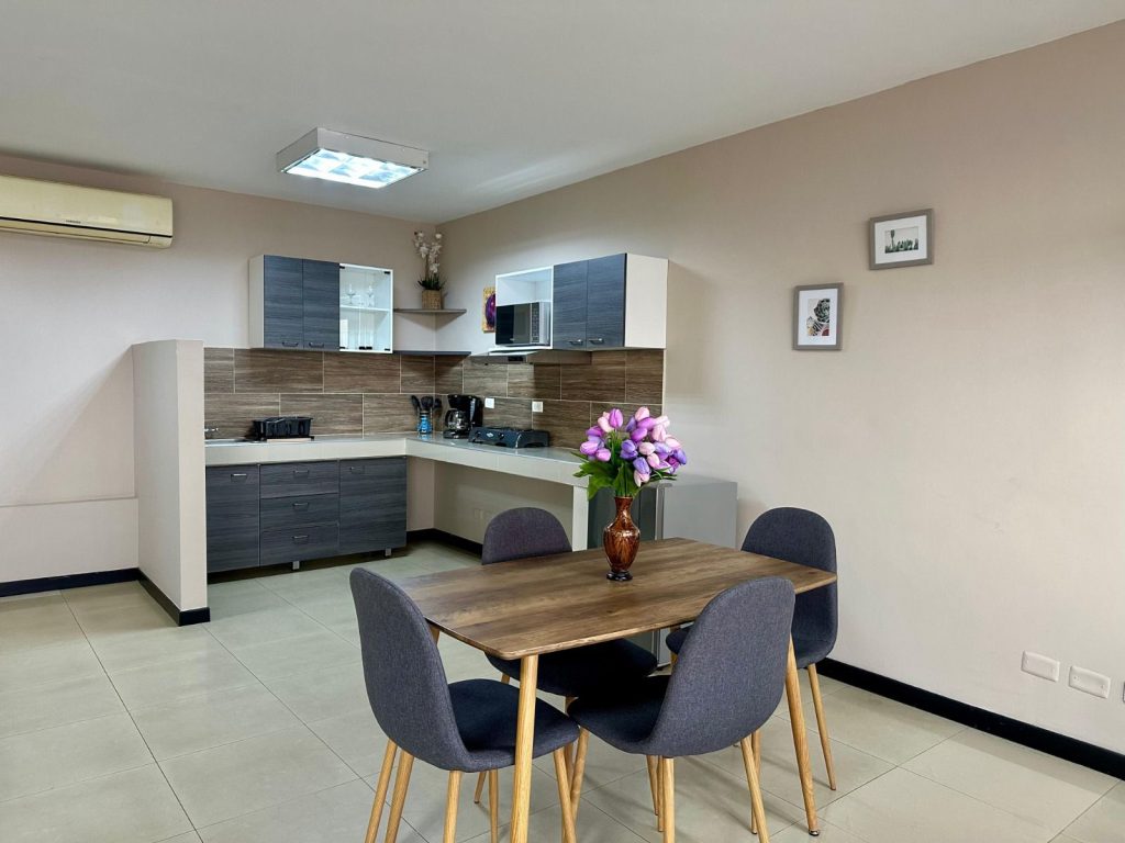 La cocina está equipada con estufa eléctrica de 2 boquillas, microondas, nevera tipo minibar, cafetera y utensilios básicos, ideal tanto para estadías cortas como prolongadas.