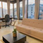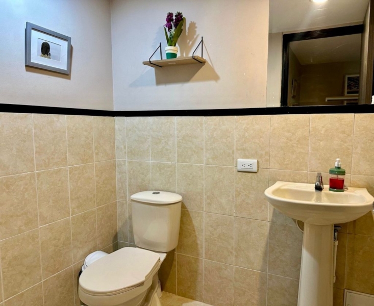 El área social cuenta con aire acondicionado, Smart TV, comedor, sofá cama y un escritorio, creando un espacio versátil perfecto para descansar, trabajar o estudiar.